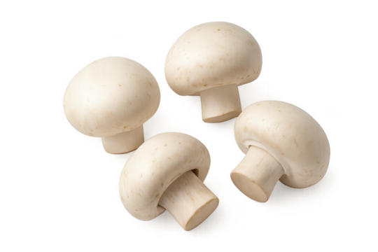 Four button mushrooms rotating on transparent background