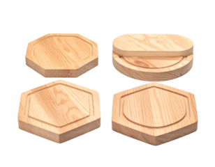 Four different shapes of blank brown paper hang tags with stitched edges and metal eyelets, isolated on transparent background