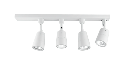 A white, modern track lighting system with four adjustable spotlights against a black background