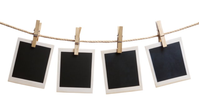 Four Blank Instant Photo Frames Hanging on a Rope – Isolated PNG Clipart on Transparent Background