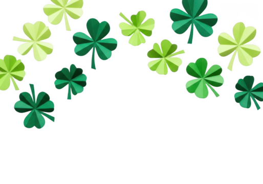four leaf clover PNG. green shamrocks falling down PNG. Lucky green shamrocks falling down in mid-air. Fresh four-leaf clovers floating, symbolizing luck and good fortune for Saint Patrick's Day.
