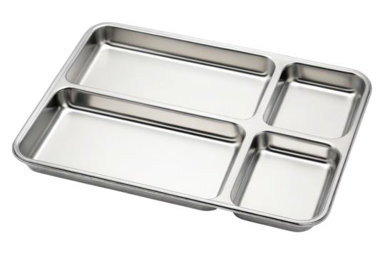 Beige plastic cafeteria tray with four compartments isolated on transparent background