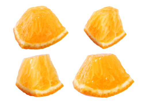 Four peeled tangerine or mandarin orange segments falling in mid-air, isolated on a transparent PNG background. Fresh citrus fruit slices perfect for food design, juice packaging, healthy diet concept