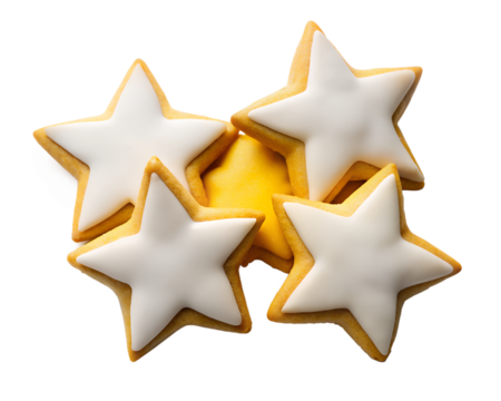 Four delicious star cut out sandwich cookies with red jam filling stacked and isolated on transparent background