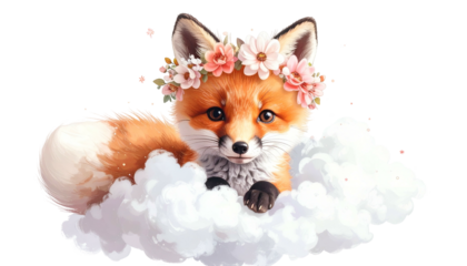 Adorable fox cub with a floral crown, nestled amongst fluffy clouds against a black backdrop