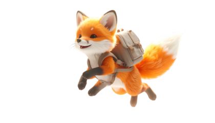 Animated orange fox with backpack smiling, in mid-leap, on a transparent background