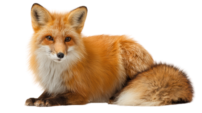 A beautiful red fox lying gracefully on a white isolated background, showcasing its stunning fur and expressive eyes.