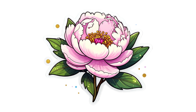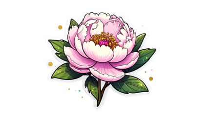 A stylized sticker featuring a blooming, pink peony with green leaves, on a black background