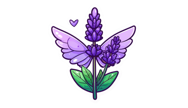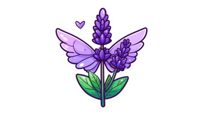 Stylized illustration of lavender sprigs with purple flowers, green leaves, and sparkles