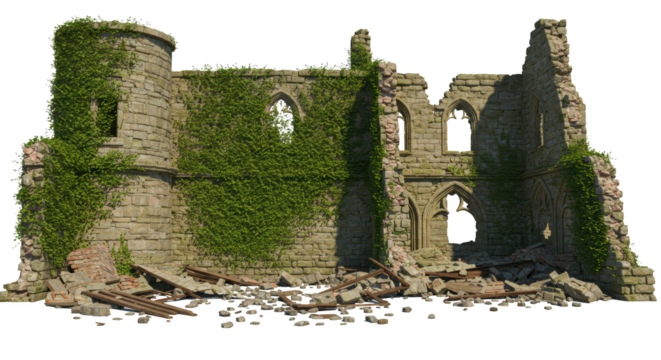 a ruined, collapsed, cracked, or broken concrete brick cement wall, isolated on a transparent background. PNG, cutout, or clipping path.