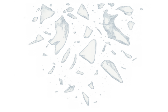 Flying glass shards breaking, transparent fragments exploding from an impact, depicting destruction and shattered reality