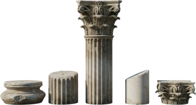 Collection of ancient Greek Corinthian architectural column fragments including a capital base and fluted shafts made of stone architecture ruin historical monument ornate transparent background