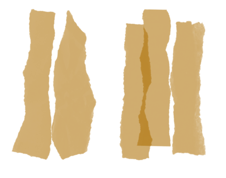 irregular shapes of rough, torn dark brown or sepia material fragments, likely paper or raw leather, isolated against a solid transparent background.