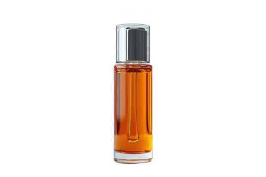 Luxury perfume bottle with golden liquid on transparent background
