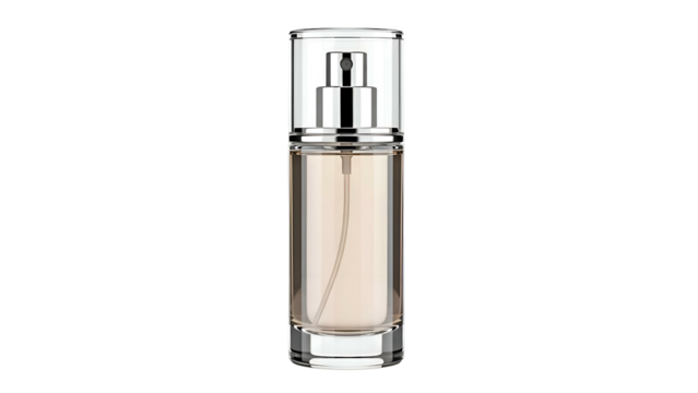 Transparent perfume bottle with pump on clear background