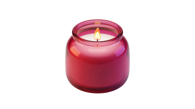 Beautiful glowing red glass jar candle emits warm, soft, soothing light on transparent background