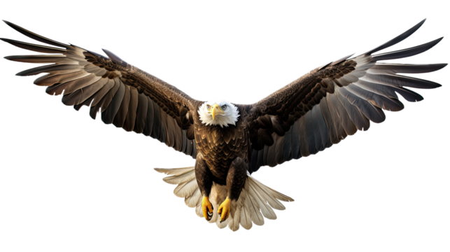 a Bald Eagle (Haliaeetus leucocephalus) in flight, full body frontal view in a  Wildlife-themed, photorealistic illustration in a PNG format, cutout, and isolated. Generative AI