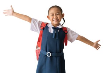 Happy asian school girl in uniform with spreading hands joy and inspiration, isolated