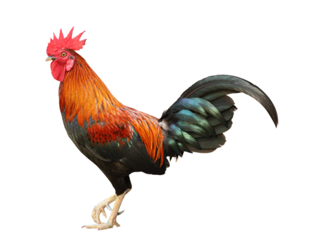 Back of colorful free range male rooster isolated on transparent or white background, clipping path ,png