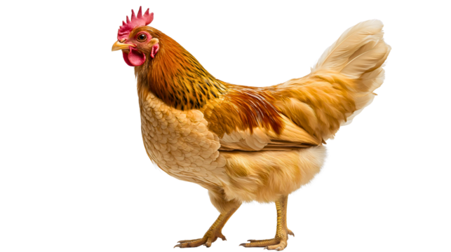 Brown chicken head close-up with its red comb and wattle, eye visible, looking towards the left, transparent background