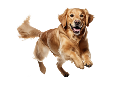 Golden retriever dog running and jumping happily on transparent background, isolated PNG image of playful golden retriever in mid-air, ideal for pet-themed designs, joyful canine actions, and dynamic