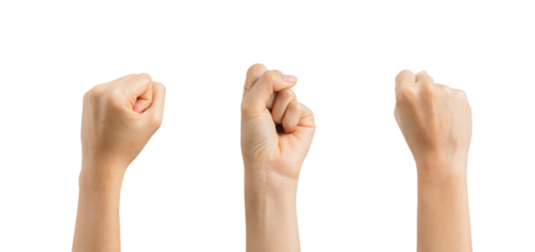 Male hand with a closed fist pointing upwards, symbolizing strength and protest on PNG white background.