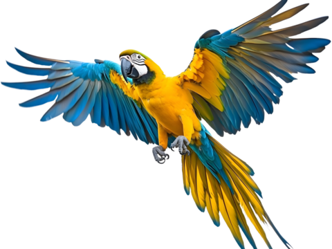 Flying macaw parrot with spread wings isolated on transparent background. Exotic tropical bird in dynamic flight pose.
