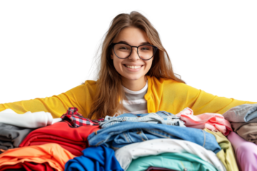 Smiling freelancer checking clothing items isolated on white background