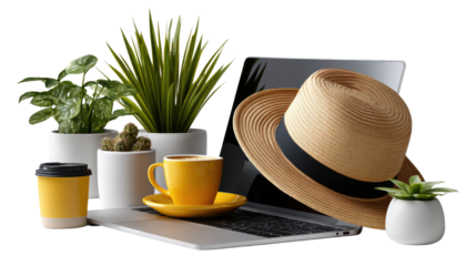Laptop and leisure: A hat rests gently on a laptop beside a mug of coffee and plant in pot, offering a vibrant scene blending work with leisure.