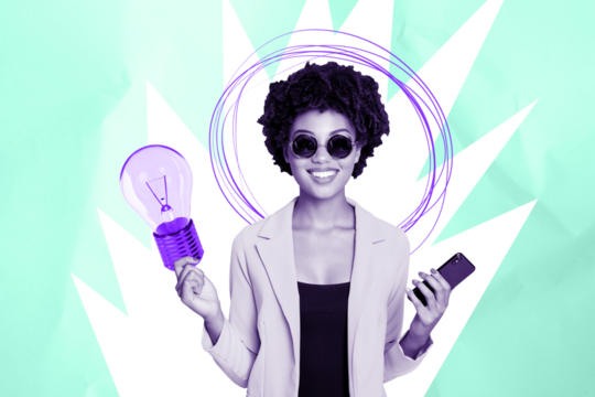Composite photo collage of happy american girl freelancer hold phone light bulb idea finding concept isolated on painted background