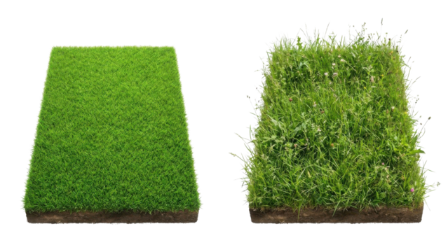 Isolated Square Patches of Neat and Wild Green Grass with Soil on White Background