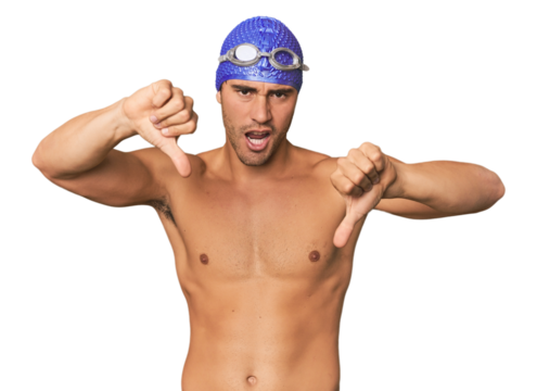 Young Hispanic man with swim gear showing thumb down and expressing dislike.