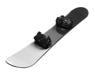 A sleek black and white snowboard, isolated on a white background, symbolizing winter sports and extreme recreation.