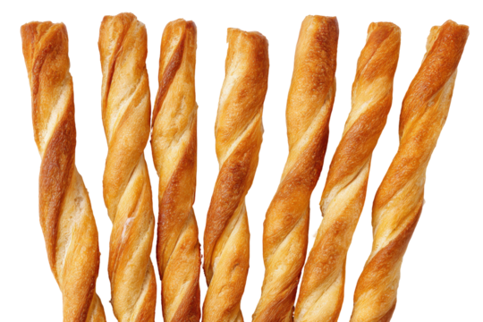 Twisted breadsticks isolated on transparent background. Golden baked twisted breadsticks snack delicious appetizer food texture isolated on white background.