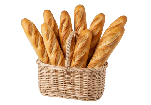 A woven basket overflowing with freshly baked golden brown french baguettes, isolated on a transparent background, showcasing a delicious assortment of crusty bread