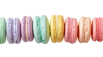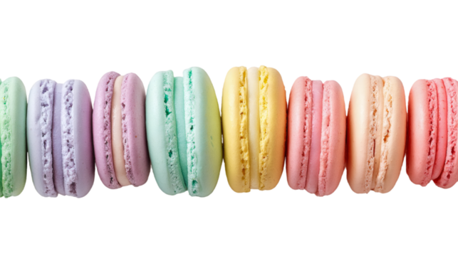 Colorful macarons lined up on a transparent background.