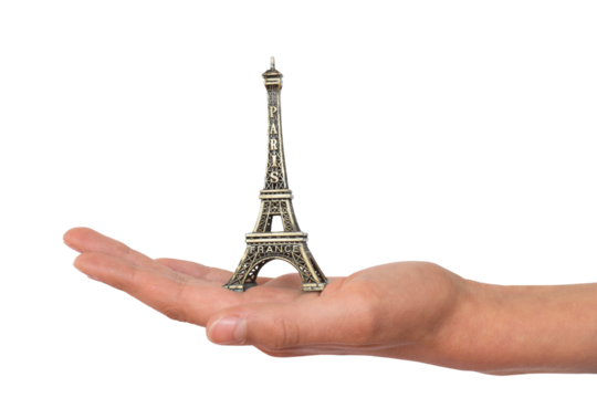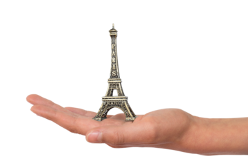 Hand holding a mini Eiffel tower souvenir figurine from Paris, France, metallic miniature statue isolated on white or transparent backround, png cut out
