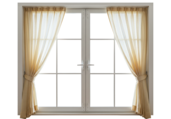 Open french casement window with white frame and glass panes, isolated on transparent background