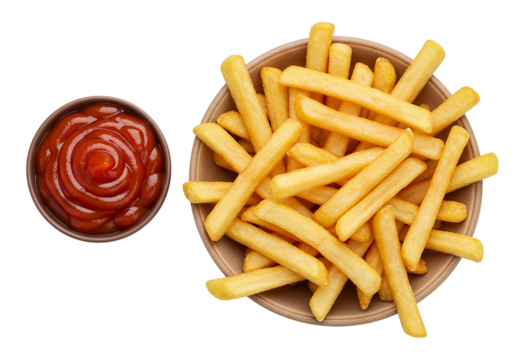 Top view golden french fries served brown bowl alongside ketchup dipping sauce isolated white background. Crispy potato fries perfect fast food snack or side dish. Classic fries everyone loves.