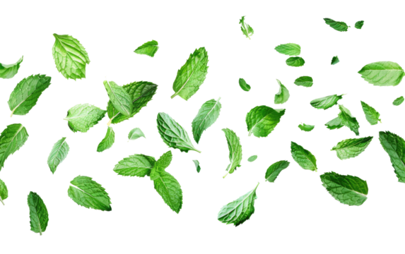 Vibrant green leaves scattered across the image, creating a lush and natural atmosphere, isolated over a blank transparent background. PNG graphic resource for autumn or spring