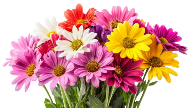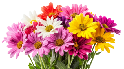 Vibrant botanical bouquet of daisies and pink blooms on transparent