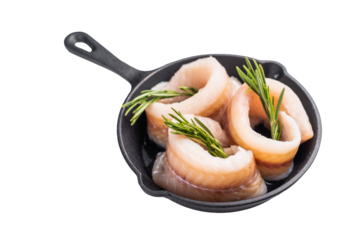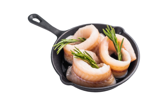 Ready for cooking Raw Pollock fish fillets in pan with herbs isolated on white background. top view