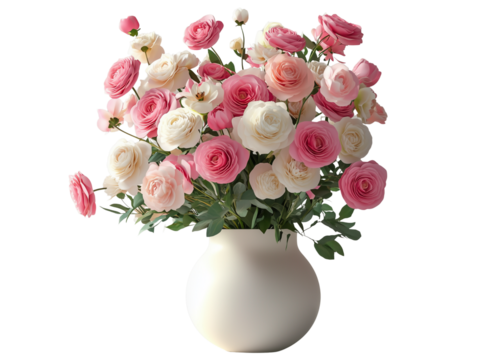 A beautiful arrangement of pink and white flowers in a simple white vase isolated on white background and transparent background