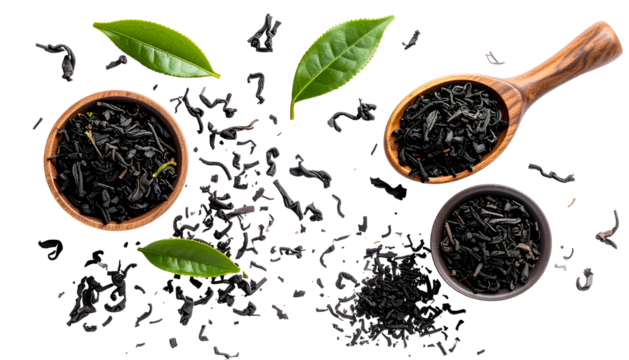 Overhead view of tea leaves, bowls, spoon, and fresh green leaves, scattered on black