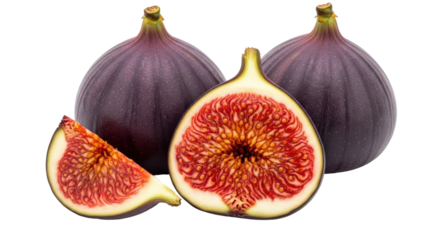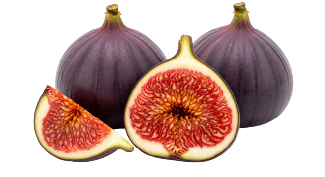 Isolated halved fig fruit next to a whole fig, showcasing its juicy interior and dark peel