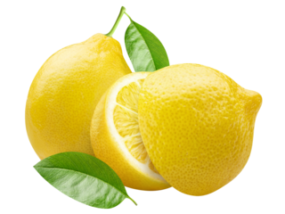 Isolated fresh citrus lemon fruits with green leaves, two clusters of sweet lemons on branches, transparent background, high-quality detail, ideal for food and beverage compositions.
