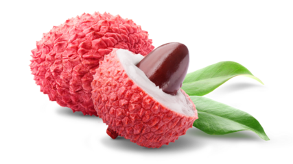 A cluster of ripe lychee fruits with leaves, perfectly cut-out on a transparent, white background, png