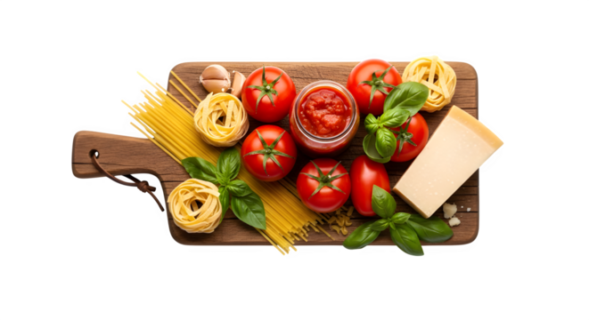 Overhead shot of fresh ingredients for italian pasta with tomato sauce, spaghetti, basil, garlic, parmesan cheese and tagliatelle isolated on transparent background