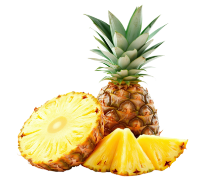 Whole pineapple with slice and half piece, isolated on transparent cutout background