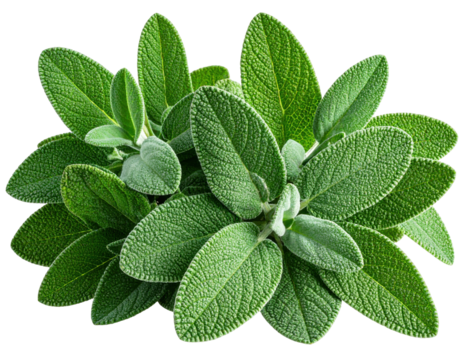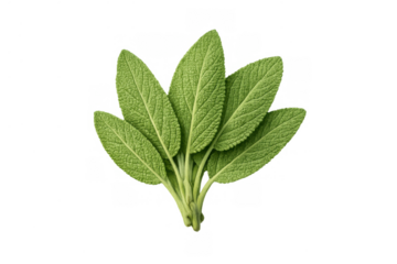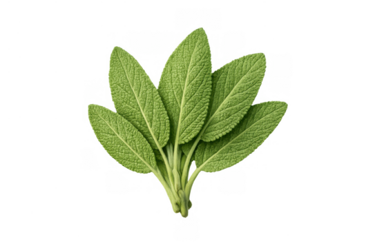 Fresh sage herb cluster with velvety texture and vibrant green leaves on white background